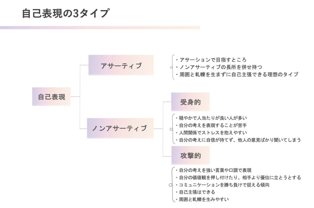 「自分も相手も大切にしようとする」自己表現法で、自分の意見や気持ちを率直にその場に相応しい方法で述べることを指します。