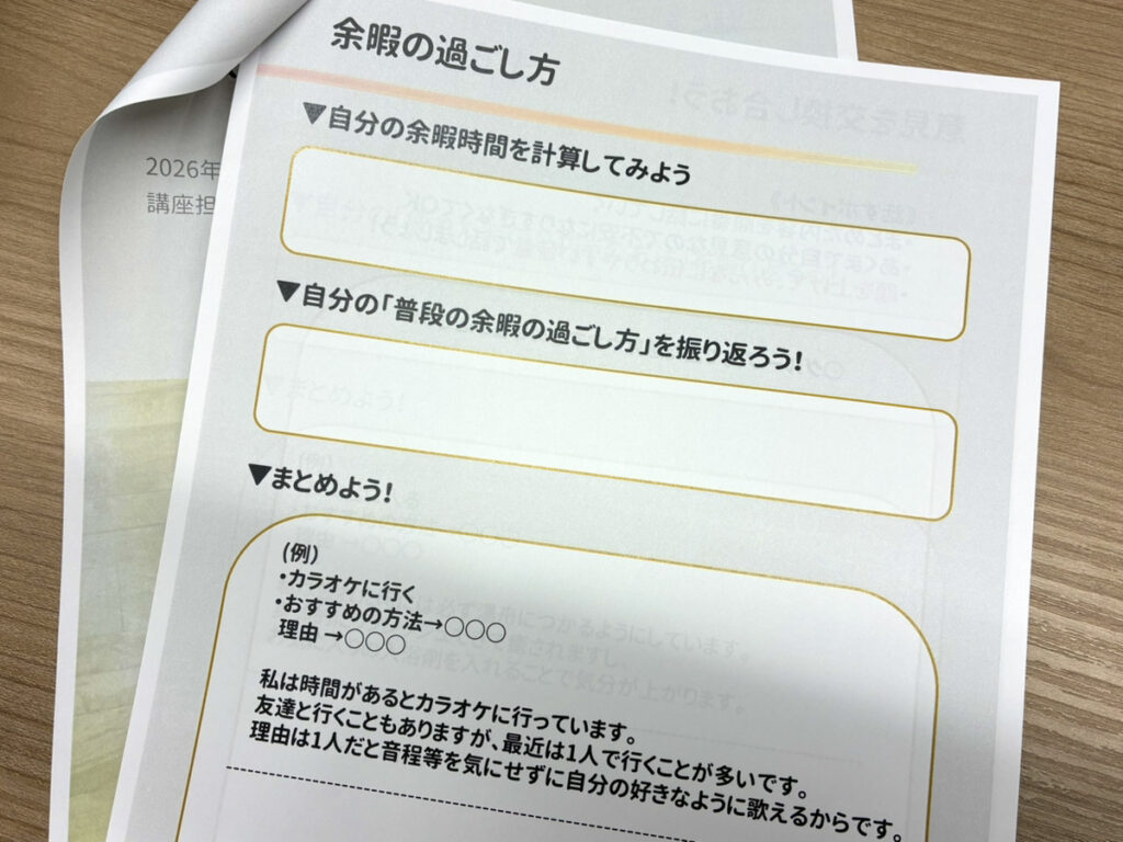 今回の講座を通して、余暇は単に休むための時間ではなく、自分自身を整えるための大切な時間であることを理解していただけたのではないかと感じています。今後も、自分に合った過ごし方を取り入れながら、心身のバランスを整え、就職に向けた準備を進めていただければと思います。