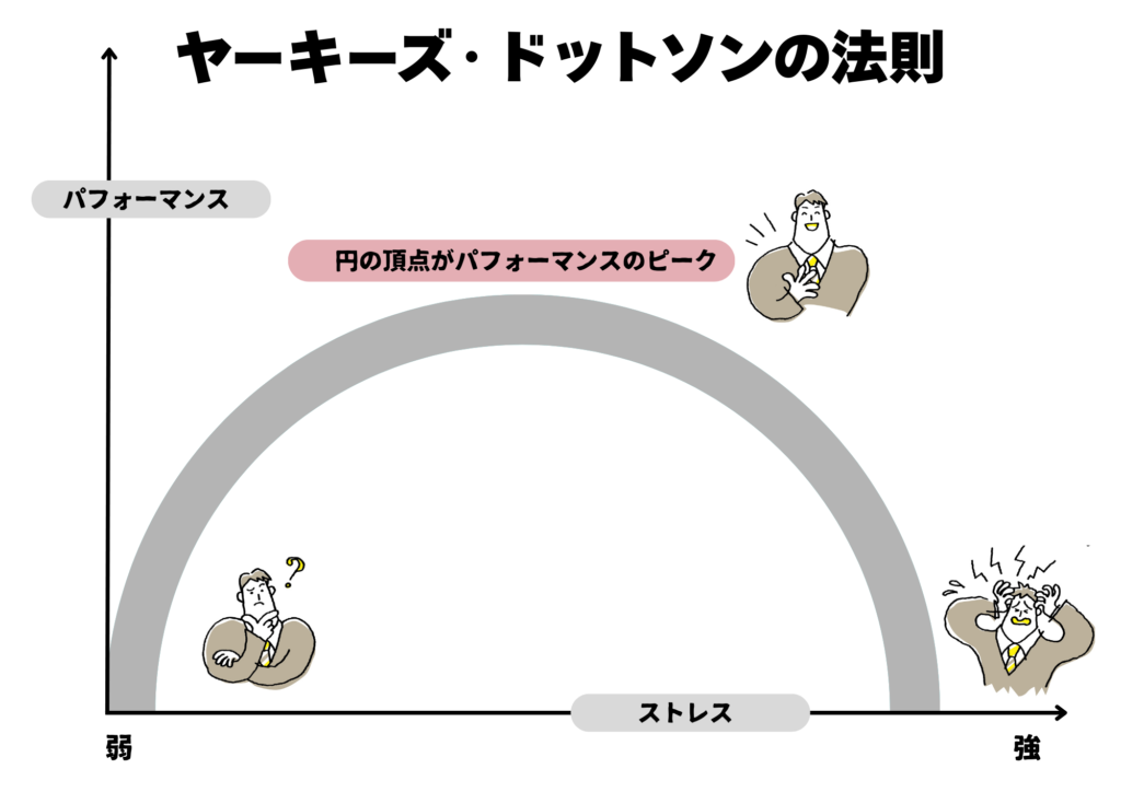 体や心にかかる精神的、身体的な負荷のことを指します。マイナス面のイメージを抱く人が多いかと思いますが、適切な量であれば集中力の向上やパフォーマンスの発揮に繋が側面があります。ヤーキーズ・ドットソンの法則では、ストレスが適度な時に人間のパフォーマンスが最も高くなると言われていますが、一方でその前後の状態では効率低下が提唱されています。