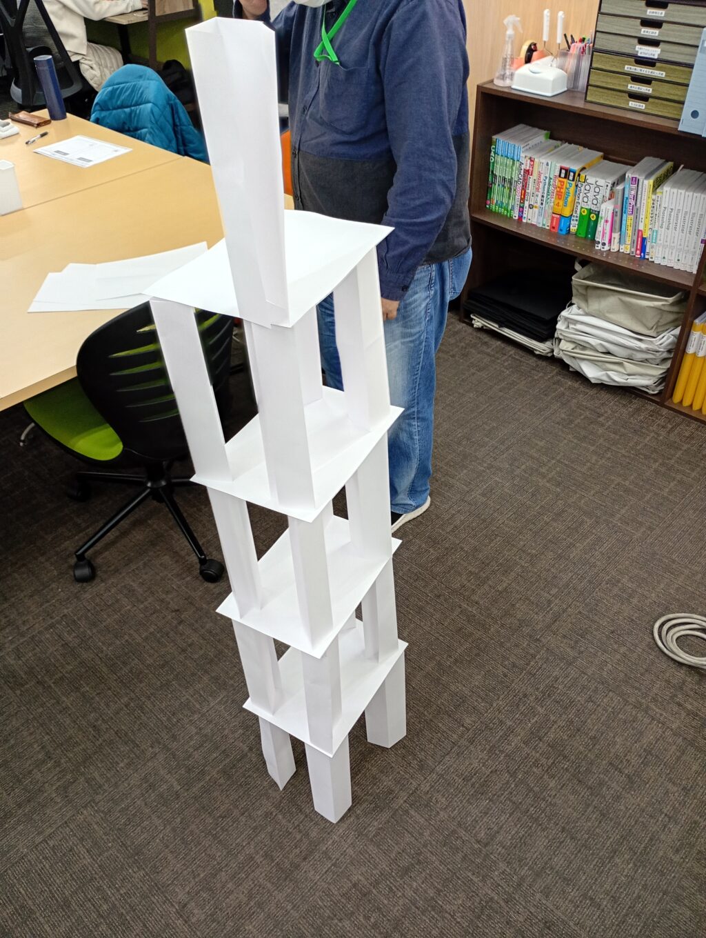 チーム全員で紙を折り、3角柱を作って積み上げていましたが、紙を手早く折ることに苦戦。30枚のうち15枚を使用して3段目まで積み上げたところで制限時間となりました⌛️